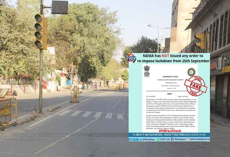 செப்ட ம்ப ர் 25முதல் நாடு தழுவிய ஊரடங்கு மீண்டும் விதிக்குமாறு அரசாங்கத்திற்கு அறிவுறுத்தியுள்ளதாக தேசிய பேரிடர் மேலாண்மை ஆணையம் கூறியுள்ள ஒரு உத்தரவு கூறுகிறது. பிஐபி உண்மை சோதனையில் இந்த உத்தரவு போலியானது. மீண்டும் ஊரடங்கு குறித்து தேசிய பேரிடர் மேலாண்மை ஆணையம் அத்தகைய எந்த உத்தரவையும் வெளியிடவில்லை பிஐபி டுவீட் செய்து உள்ளது.