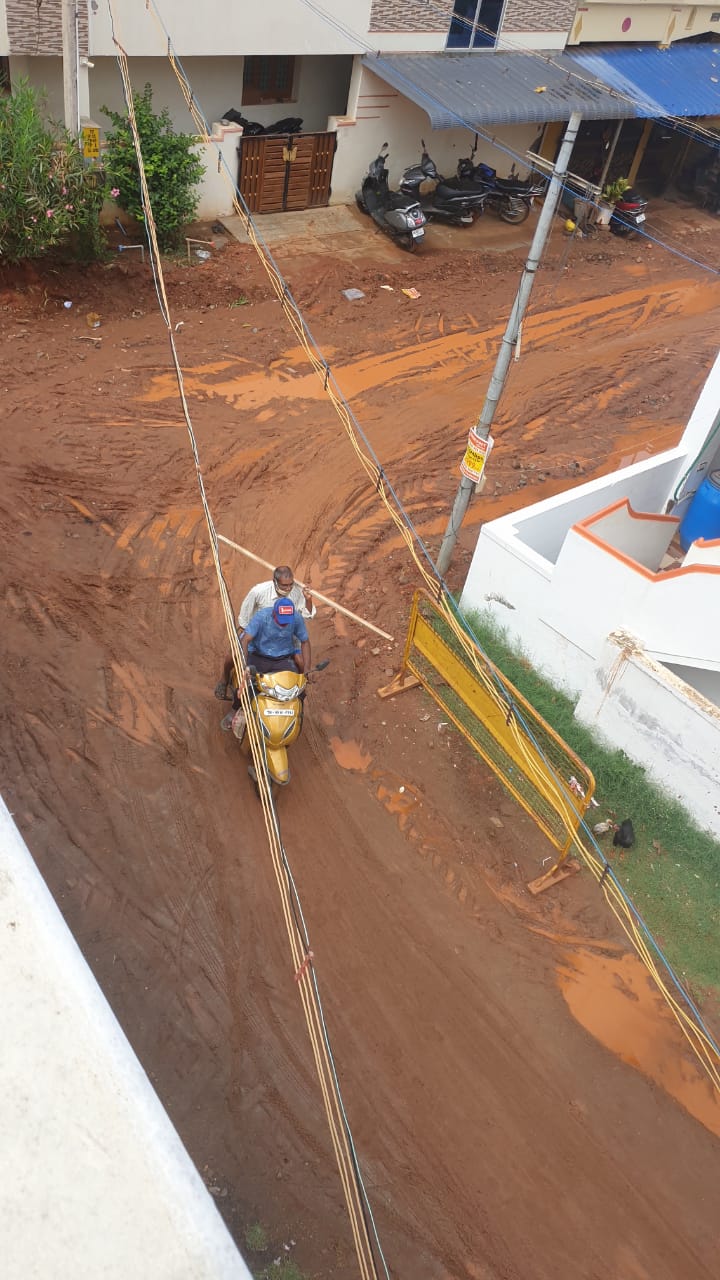 குடியிருப்பு பகுதியில் ரோடு மோசமான சூழ்நிலையாக குண்டும் குழியாக உள்ளது. இங்கு சுமார் 250 குடும்பதினருக்கு மேல் வசித்து வருகின்றனர். தாய்மார்கள், பெரியோர்கள், கர்ப்பிணி பெண்கள், குழந்தைகள், மாணவர் மாணவிகள், முதியவர்கள் ஆகியோர் மருத்துவ சிகிச்சைக்காக அவசர காலத்திற்கு வெளிய செல்வதற்க்கு முடிவதில்லை. மழை நீர் வெளியே செல்லாமல் குளம் குட்டை போல் தேங்கி நிற்கிறது. இதனால் 108 ஆம்புலன்சும் இதர வண்டி வாகனமும் செல்வதற்கு இடையூறாக இருக்கிறது. இதனால் கொரோனா நோய் தொற்று ஏற்படும் அபாயமும் மற்றும் கொசு தொல்லை காய்ச்சல் சளி இருமல் வாந்தி பேதி ஆகிய நோய்கள் பரவும் அப்பயமும் உள்ளது.